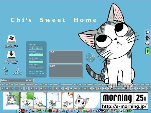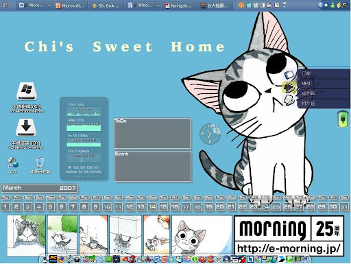 Yahoo!奇摩 Widget Engine 這個軟體可愛的地方,就在於它的操作及簡單 、一鍵安裝,而且是繁體中文,初學者相當好上手。另外就是它所囊括的工具非常多元,從桌面時鐘、桌面月曆、桌面捷徑、桌面寵物、氣象,甚至連 NoteBook 的電池計量器都有。所下載的 Widget 只要直接執行就可以開始使用了 (夠簡單了吧)。當然前提是你已安裝並執行 Yahoo!奇摩 Widget Engine。以下就看看我之前所做的桌面吧: